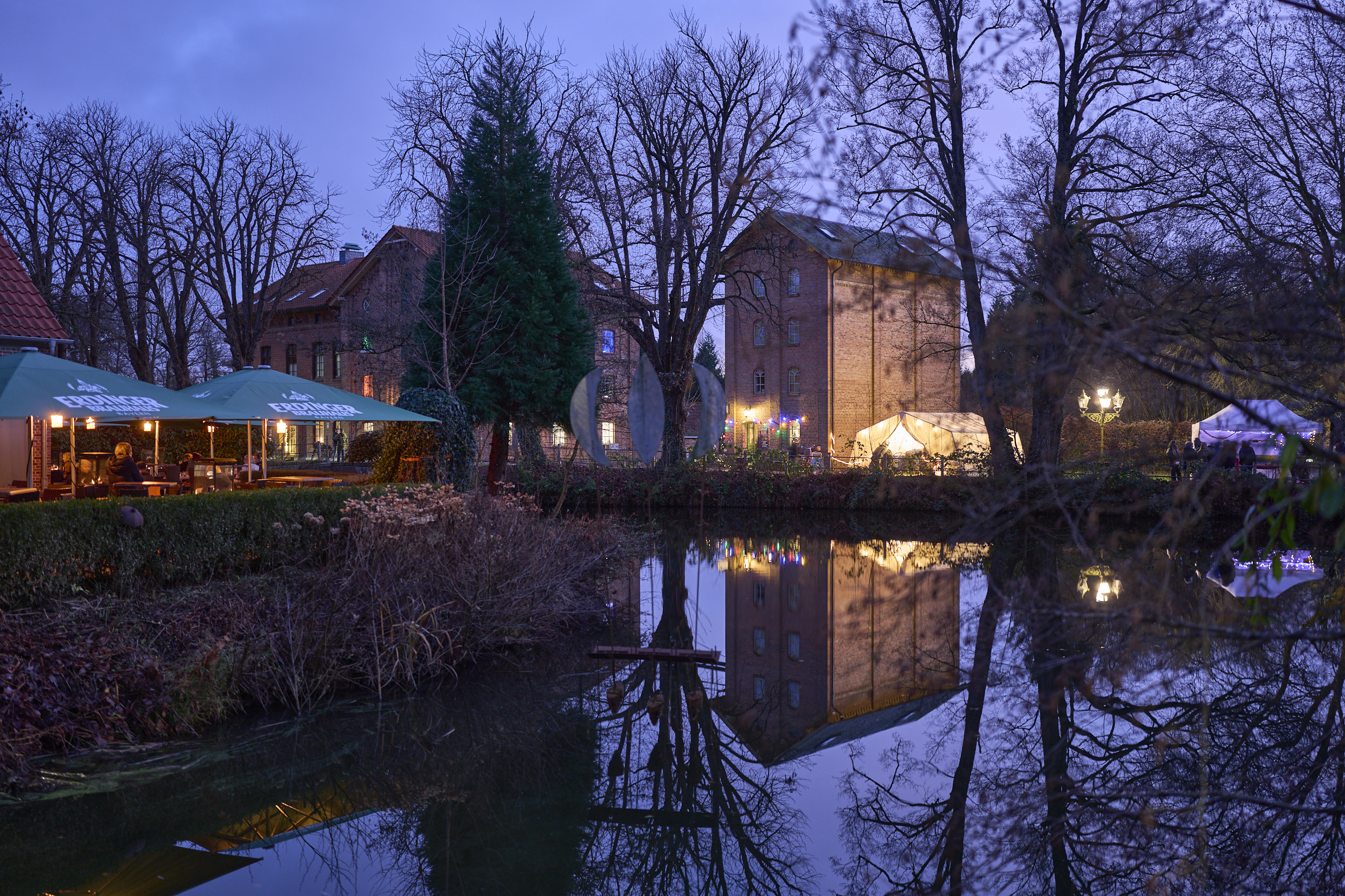 Der Blick ĂŒber den Barmstedter Burggraben zur funktionstĂŒchtigen WassermĂŒhle. Sony A1 II mit dem 35mm GM.