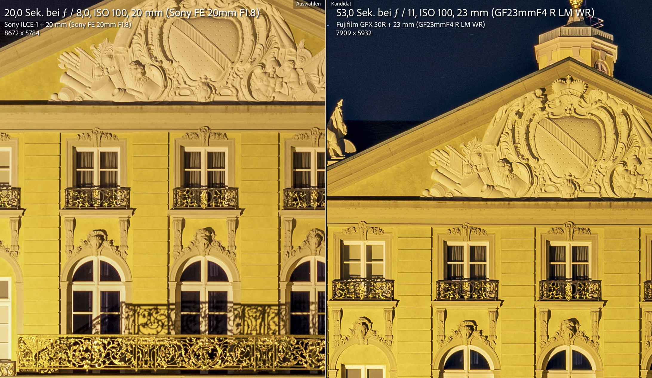 Vorweg: Der Titel sagt es schon: Das folgende ist kein wissenschaftlicher Versuch, sondern ein erster Vergleich. Er leidet darunter, dass es naturgemäß unterschiedliche Objektive sind an den beiden Kameras, dass ich möglicherweise den Fokus nicht exakt gleich gesetzt habe,... Aber es ist trotzdem interessant zu sehen, deshalb wollte ich es euch nicht vorenthalten. Ich mache bestimmt bei Gelegenheit noch mehr, dann hoffentlich mit meiner eigenen Fuji. Also: Ich war vergangenen Dienstag Abend in Karlsruhe unterwegs. Wie John Wayne, mit Doppelgurt und zwei Waffen an der Hüfte (der Sony a1 und der Fuji GFX 50r) sowie der Langflinte (mein Gitzo-Stativ) in der Armbeuge. Ziel war eigentlich einfach ein abendlicher Spaziergang mit ein paar Architekturfotos - ich mache das ganz gern mal auf Dienstreisen. Ich habe nicht viele vergleichende Aufnahmen gemacht, aber ein paar schon. Ein Bilderpaar vom Karlsruher Schloss möchte ich euch hier zunächst zeigen: Zuerst die Sony, ausgerüstet mit dem 20mm 1.8 bei F8, ISO 100, 20s Belichtung. Und dann die Fuji, ausgerüstet mit dem 23mm F4 bei F11, ISO 100, 53s Belichtung (Die Fuji braucht scheinbar etwas länger zur gleichen Beleuchtung, die Brennweite entspricht etwa 18mm, durch das andere Format relativiert sich das aber direkt wieder). Beide Bilder sind absolut identisch in LR entwickelt. Auf das Geradziehen habe ich verzichtet, um die Originalschärfe nicht zu verwässern. Selbst in der Forenauflösung sieht man, dass die Fuji die feinen Schattierungen an den Steinen des Schlosses besser darstellt. Sogar noch etwas dramatischer sieht man es im Pflaster, wobei ich hier eventuell den Fokus beim Sony etwas weiter gen unendlich habe (glaube ich eigentlich nicht, die grundsätzliche schärfe ist da). Und man sieht, dass die Fuji deutlich mehr Sterne über dem Schloss entdeckt hat als die Sony. Hier noch ein 200% Ausschnitt: Ich überlasse das mal der Bewertung jedes einzelnen, für ein wirkliches Urteil sind einfach zu viele Faktoren unterschiedlich. Aber ich wäre mir für mich sehr sicher, wenn ich nur mit einer der beiden losziehen dürfte zu dieser Art Fotos, welche ich wählen würde. Ein zweites Bilderpaar folgt dann noch später.